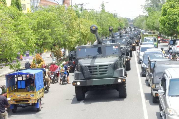 Meriam Caesar 155mm yang diawaki Yonarmed 12/Kostrad, baru saja melakukan pemanasan dengan jalan-jalan keliling Ngawi. Pemanasan ini dilakukan dalam rangka perawatan sekaligus pemeliharaan alutsista (alat utama sistem senjata) secara rutin, sesuai prosedur maintenance yang telah ditentukan.