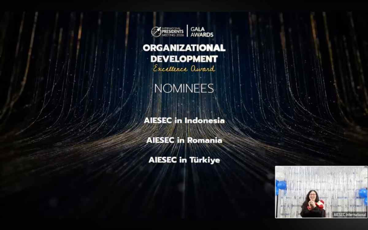 Selain meraih penghargaan di bidang hubungan eksternal, AIESEC in Indonesia juga berhasil masuk nominasi tiga besar Organizational Development Excellence Award. Kategori ini diberikan kepada entitas yang menunjukkan keunggulan dalam pengembangan organisasi, termasuk manajemen sumber daya manusia, sistem tata kelola, penguatan budaya organisasi, serta keberlanjutan kepemimpinan.