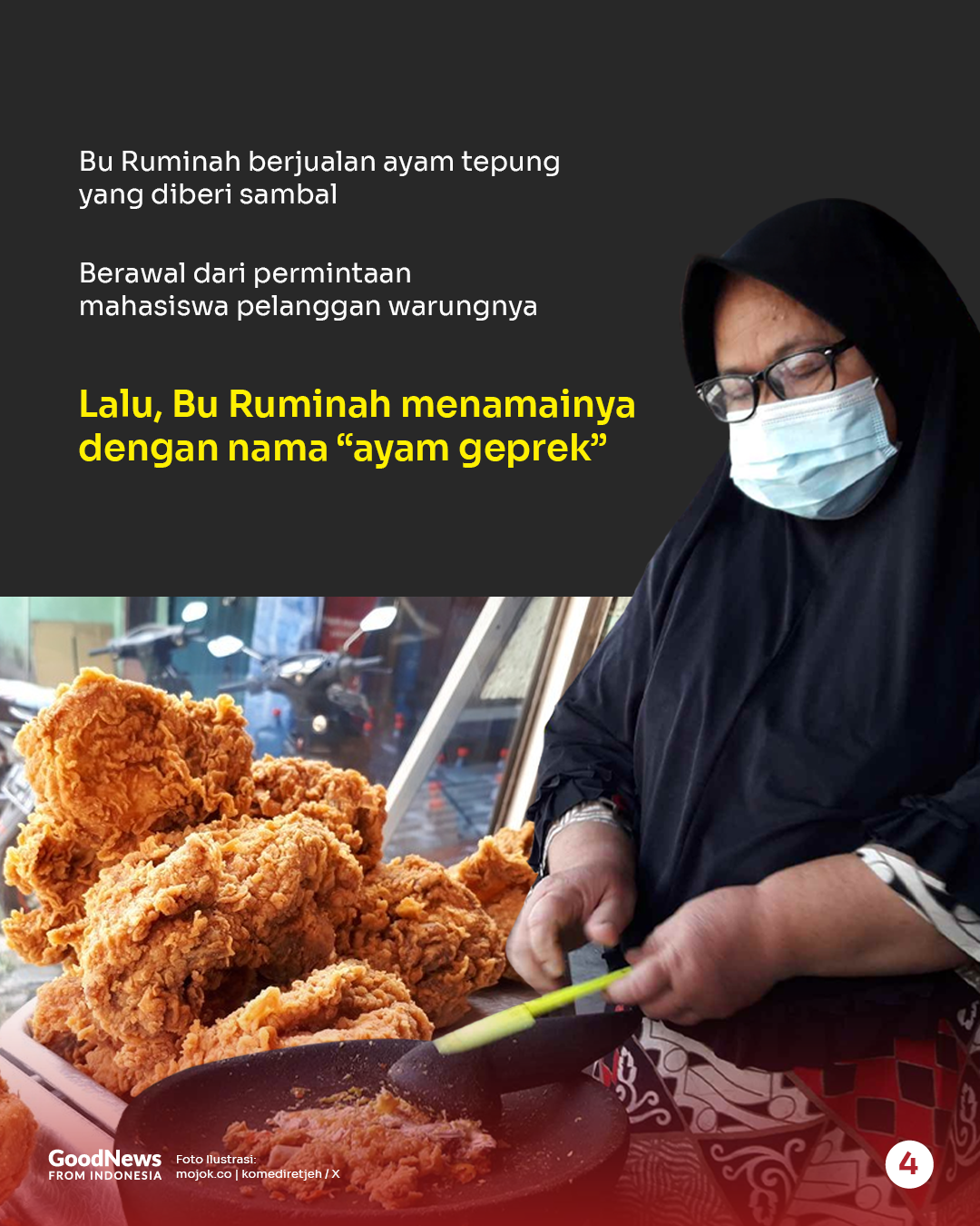 Awalnya, ia hanya menjajakan ayam goreng tepung biasa sebelum seorang mahasiswa pelanggan setianya meminta agar ayam gorengnya dilumatkan bersama sambal. Sajian seperti itulah yang kemudian dikenal luas sebagai ayam geprek.