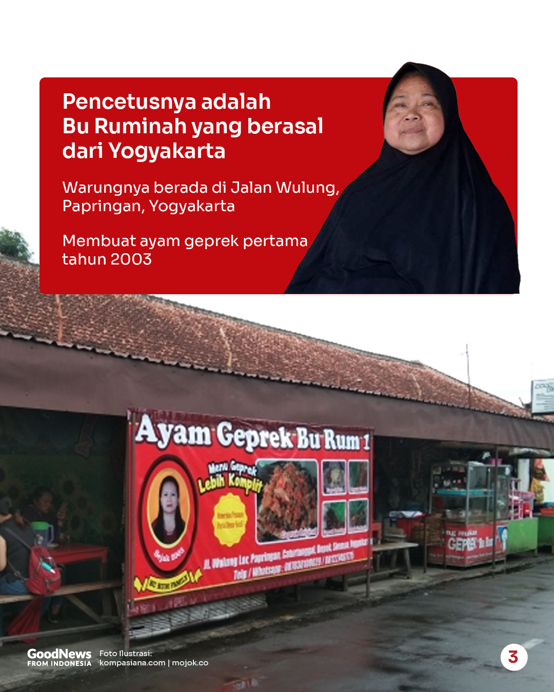 Sejarah Ayam Geprek populer bermula dari sebuah warung sederhana di Jalan Wulung, Papringan, Yogyakarta. Sosok di balik inovasi tersebut adalah Bu Ruminah, yang pada tahun 2003 silam secara tidak sengaja menciptakan perpaduan ayam goreng tepung dengan ulekan cabai.